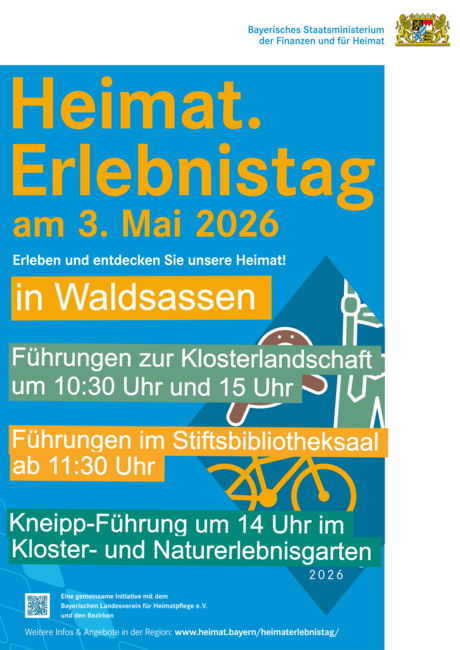 Am Sonntag, den 3. Mai 2026  ist wieder ein Heimat.Erlebnistag in Bayern: Ein Tag, der Bayerns Vielfalt und Einzigartigkeit lebendig werden lässt! Die gemeinsame Initiative des Heimatministeriums, des Landesvereins für Heimatpflege e.V. und der Bezirke lädt Menschen in ganz Bayern ein, mit eigenen Veranstaltungen ihre persönliche Heimat vorzustellen. Der Tag soll erlebbar machen, was Bayern ausmacht: einzigartige Traditionen, Bräuche, Dialekte, Volksmusik, Vereinsleben und vor allem herausragendes Engagement. Waldsassen lädt zu vier interessanten Führungen ein:
